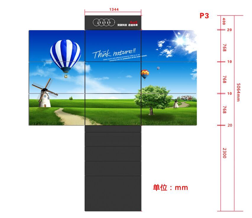 LED旋轉屏以靈活多變的旋轉姿態吸引著人們的注意,其結構整體為三角柱體形狀,中間視頻顯示部分由三層三角形LED箱體構成。在旋轉系統的控制下,三個LED屏體相互配合,旋轉動作與視頻畫面協調運作,三面共九個小LED顯示屏可單獨播放視頻,也可拼接為三個視頻或將三面三層LED拼接為一個整體視頻播放。動態屏幕與視頻畫面完美結合,為人們帶來震撼的視覺沖擊力,進而促進投放戶外廣告的有效傳播。